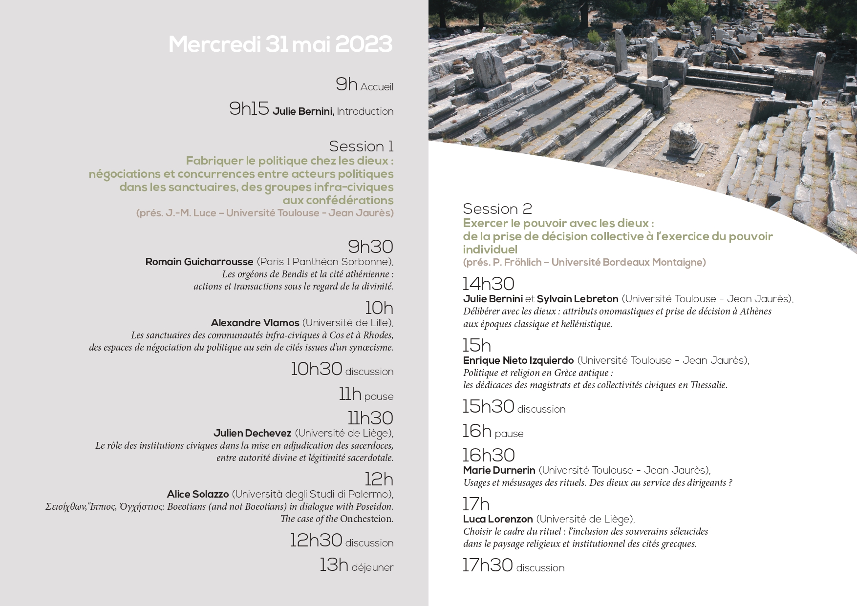 Le monde des cités grecques ne saurait se comprendre sans tenir compte de la relation étroite et permanente qui unissait les hommes et les dieux, à différents niveaux et dans tous les domaines d’activités, aussi bien publiques que domestiques. La journée s’intègre dans les objectifs du projet ERC MAP de sorte que l’accent sera mis sur la manière dont les différents acteurs de la vie politique s’accommodaient et s’emparaient du cadre institutionnel dans lequel s’inscrit le dialogue avec les divinités pour servir la communauté civique ou d’autres intérêts.